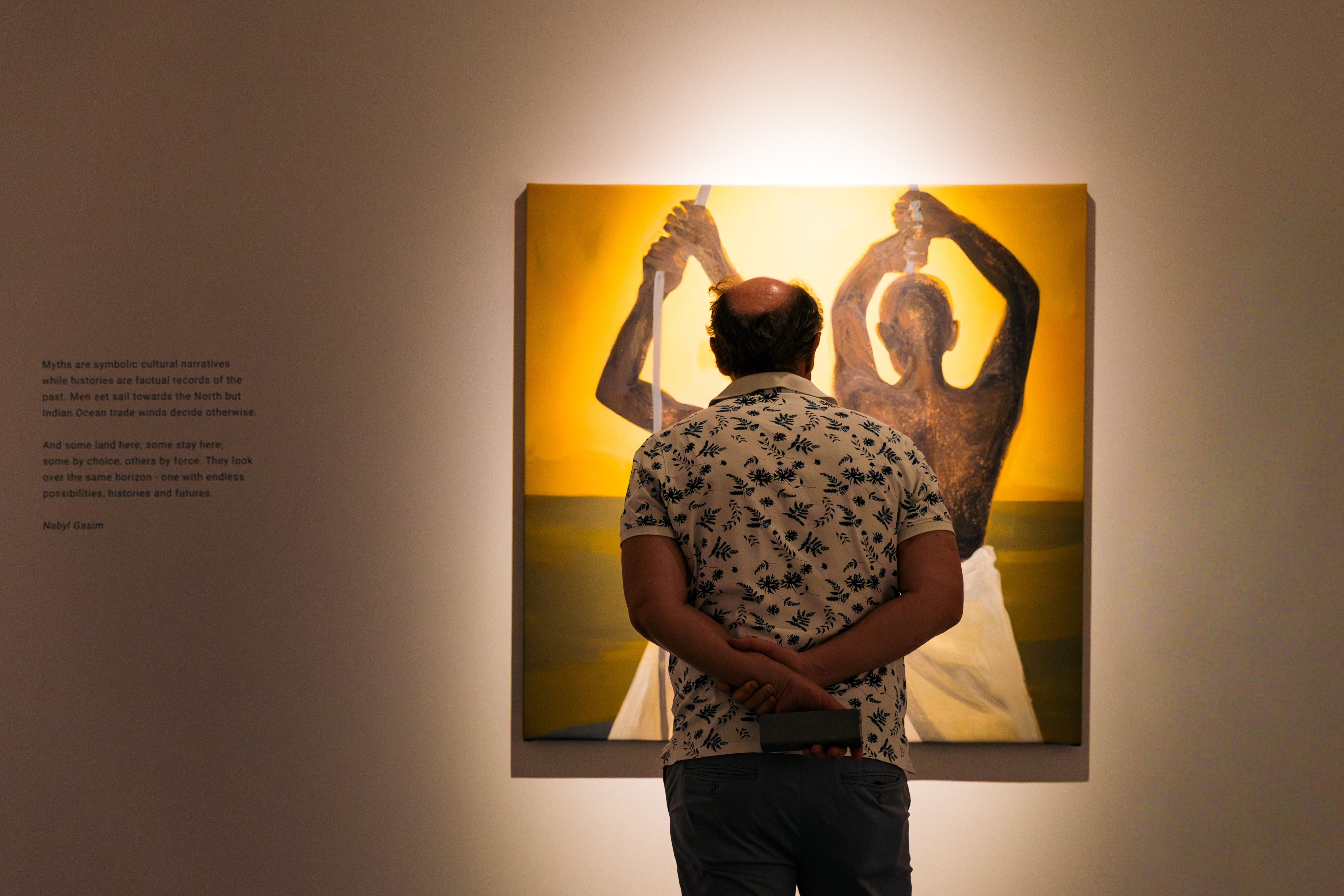 Badeeu resists glorifying the celebrated king of myth. Instead, he turns his gaze to the unnamed: the slaves, the laborers, the forgotten hands who built the myth’s foundation. The loose, untied palm leaves fluttering in his paintings might symbolise their yearning for freedom - the dream of the commoner. In one haunting portrait, an old man, dimly lit as if in the gallows of a ship, seems lost in such a dream. New beginnings are possible, Badeeu suggests, but always at a cost. Would those slaves ever taste the freedom mythically bestowed upon a king?