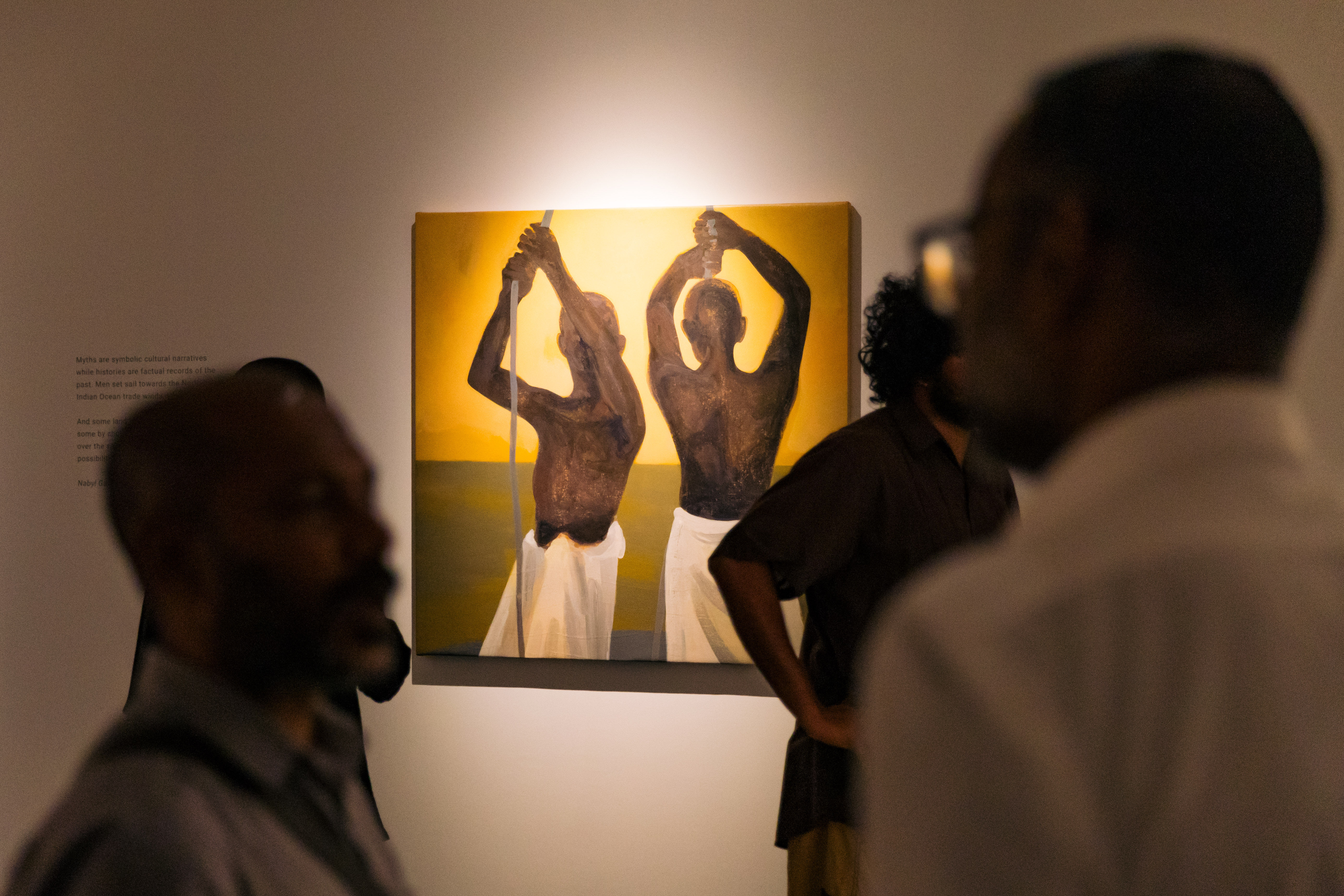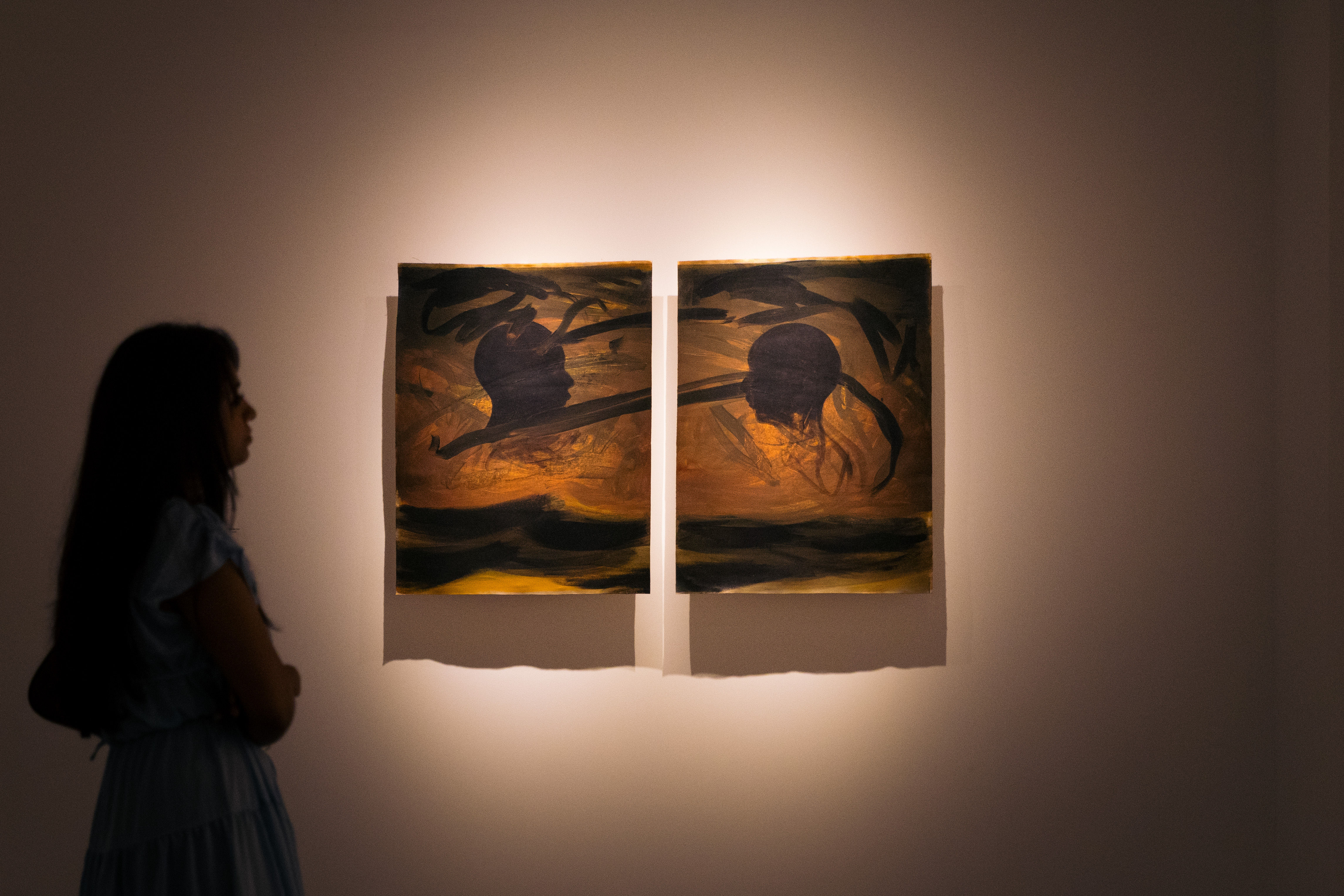 At first glance, the canvases - washed in acrylic with ochre hues and marked by bold, moody strokes - evoked nostalgia and warmth, reminiscent of firelight or a fading sunset. Yet, as I lingered before each piece, absorbing the silences between them, a deeper complexity emerged. Beneath the warmth lay tension: hope intertwined with unease, freedom shadowed by grimness. It felt as though Badeeu had deliberately cloaked darker truths beneath familiar colors, drawing viewers into a labyrinth of figurative abstraction and unanswered questions.