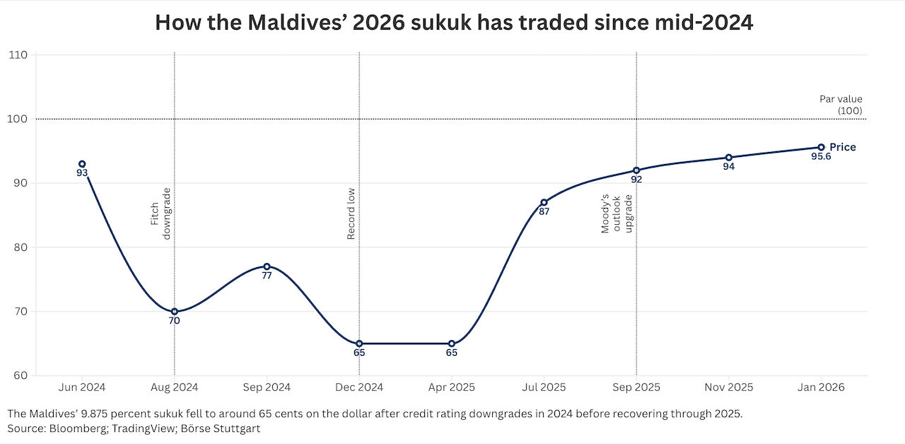 The sukuk was trading at 95.6 cents on the dollar on Thursday – within striking distance of par (the 100-cent face value bondholders receive at maturity) – recovering from lows of around 70 cents in late 2024 and a record low of 65 cents in April 2025. The lows came when investors priced in a severe haircut after credit ratings agencies Fitch and Moody's downgraded the Maldives to "junk" status.