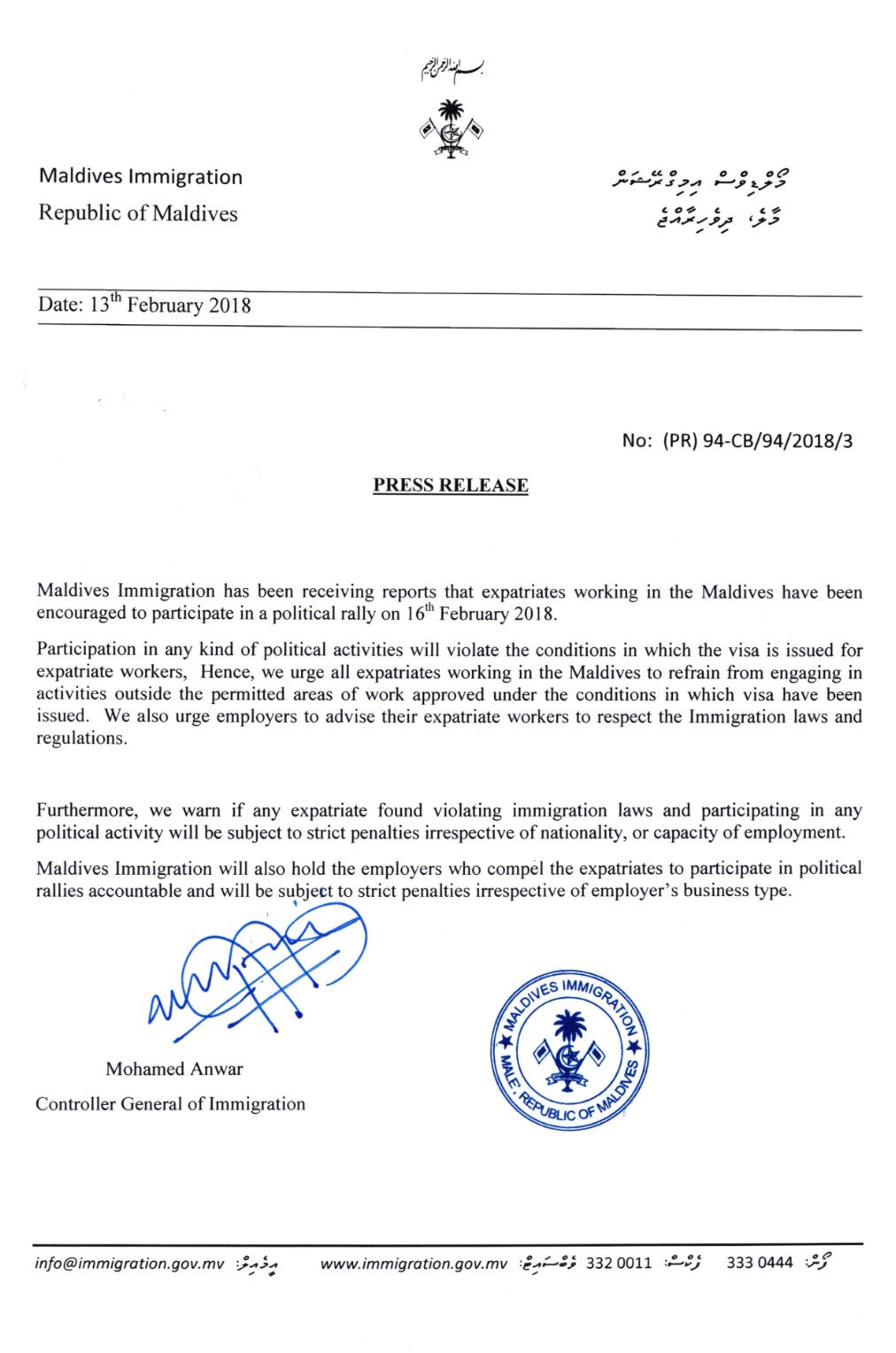 “Participation in any political activities will violate the conditions in which the visa is issued for expatriate workers,” said Maldives Immigration, adding it had received reports of migrant workers being encouraged to participate in an opposition rally this Friday.