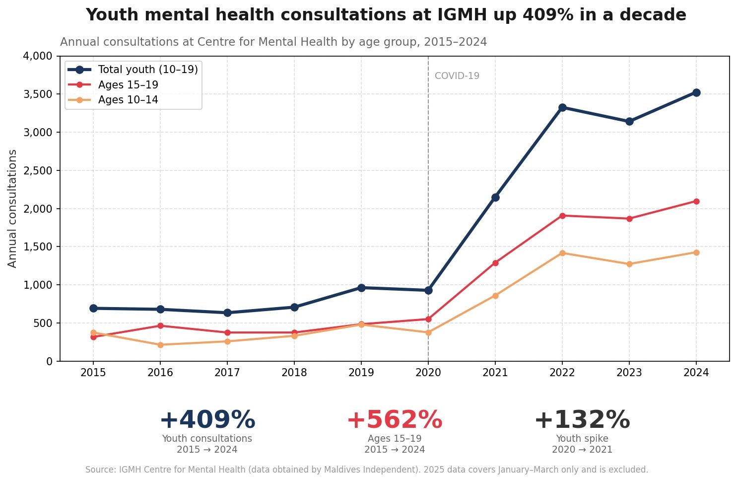 Data obtained by the Maldives Independent from the government-run Indira Gandhi Memorial Hospital shows the scale of what providers are facing. Youth mental health consultations for patients aged 10 to 19 increased by more than 400 percent or roughly fivefold between 2015 and 2024.