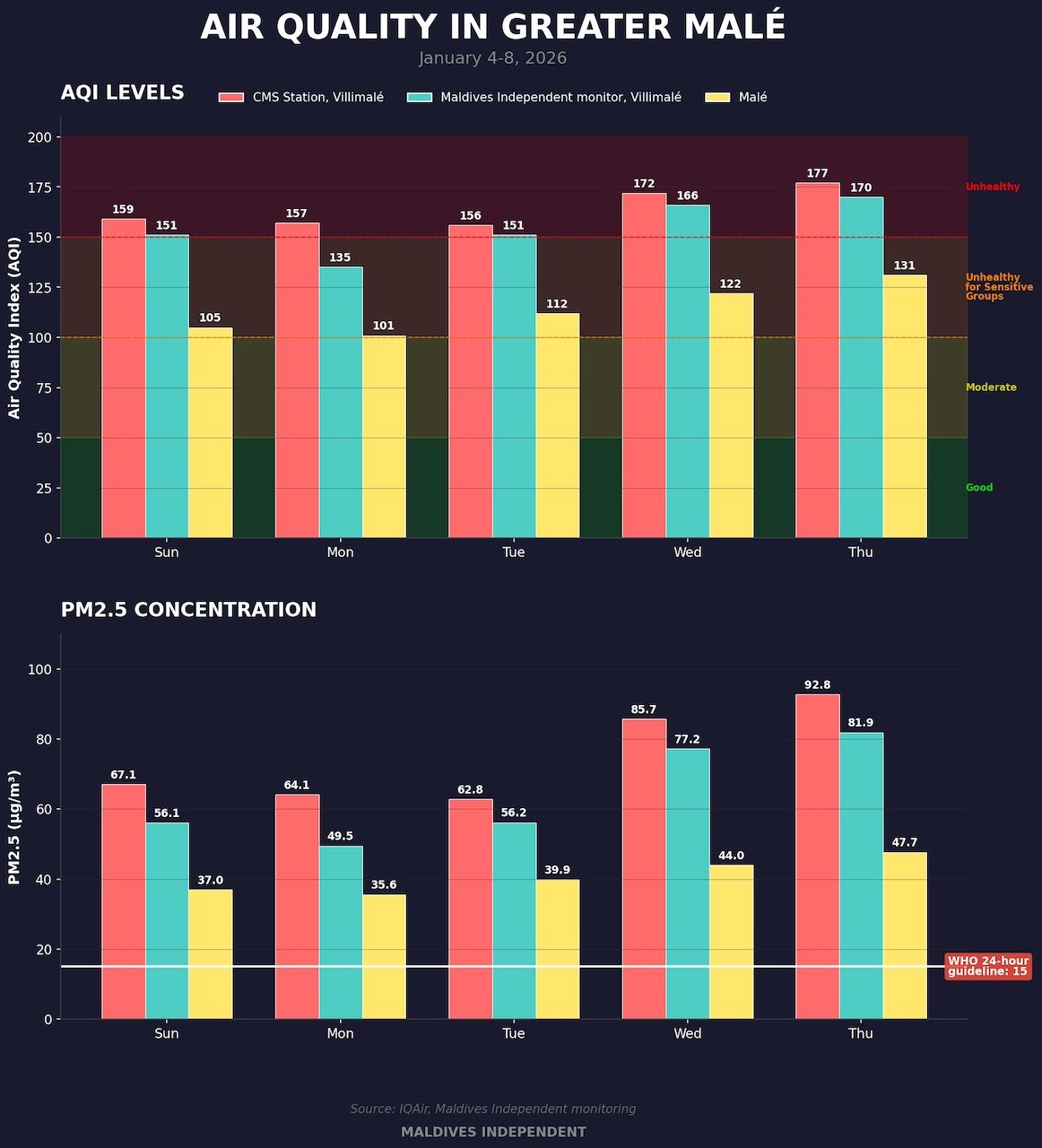 IQAir app or website (search "Malé" or "Maldives") – shows real-time AQI from multiple monitors